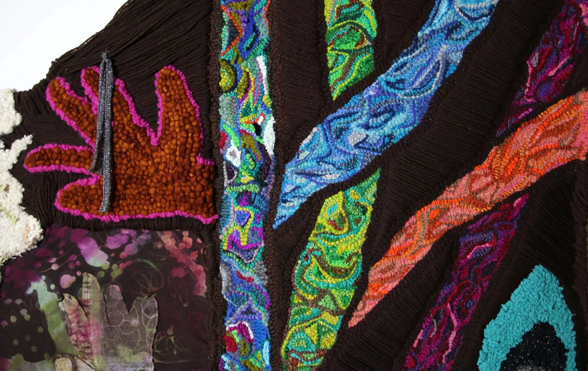 For Saul (detail), rug hooking, punch needle, batik, sewing, appliqué, mixed fibers on raw linen, 57 x 66 inches, 2023.